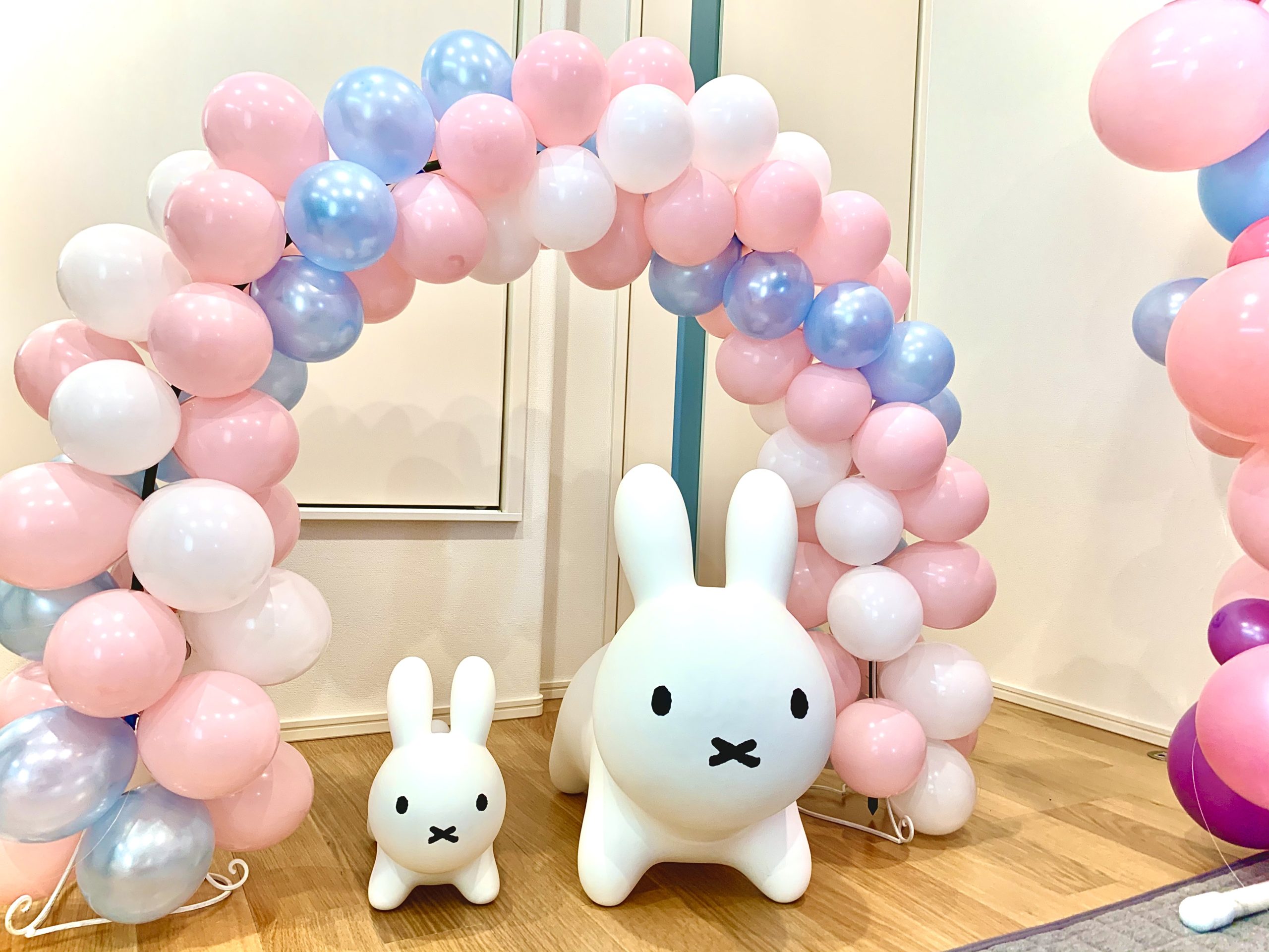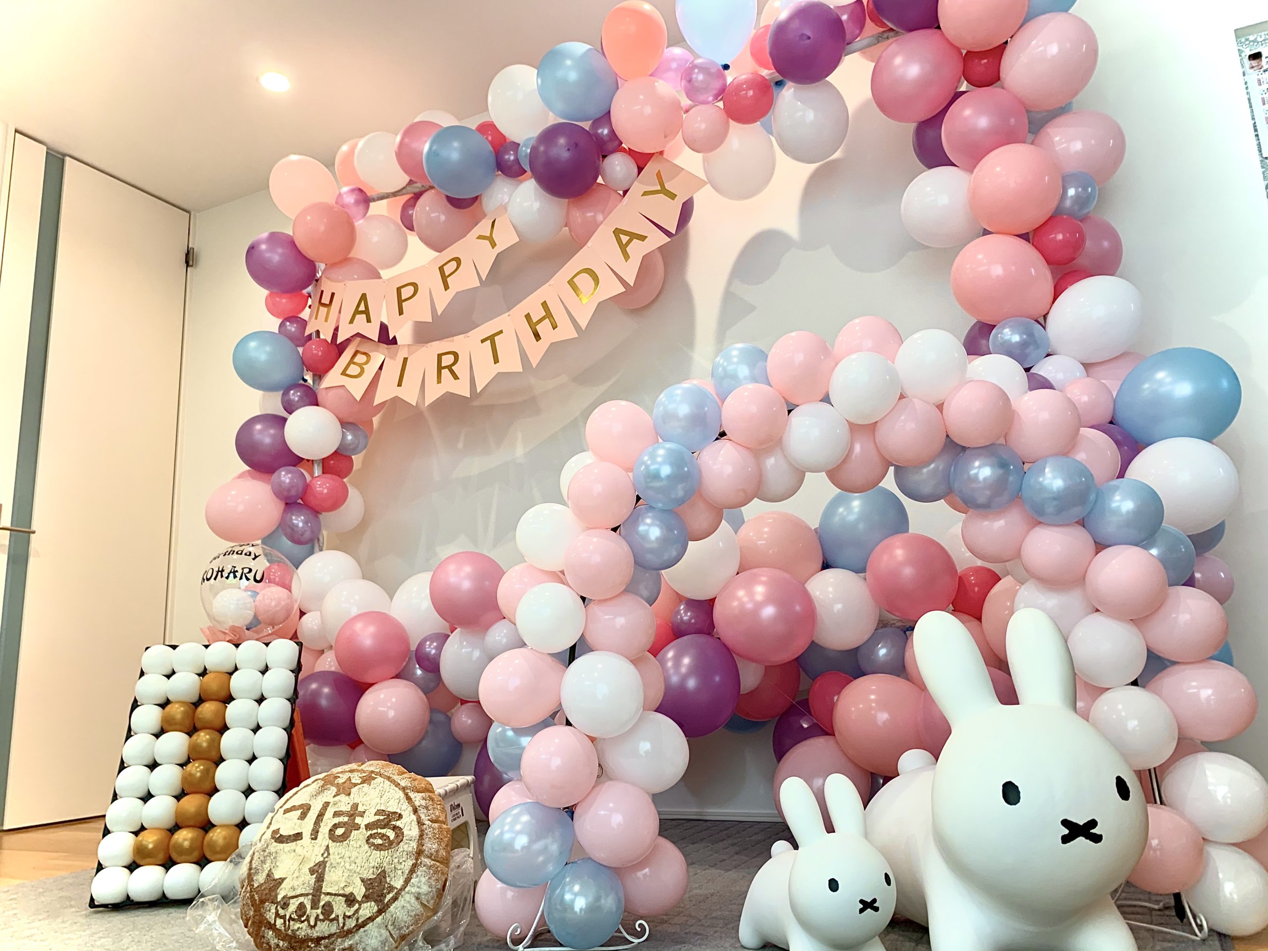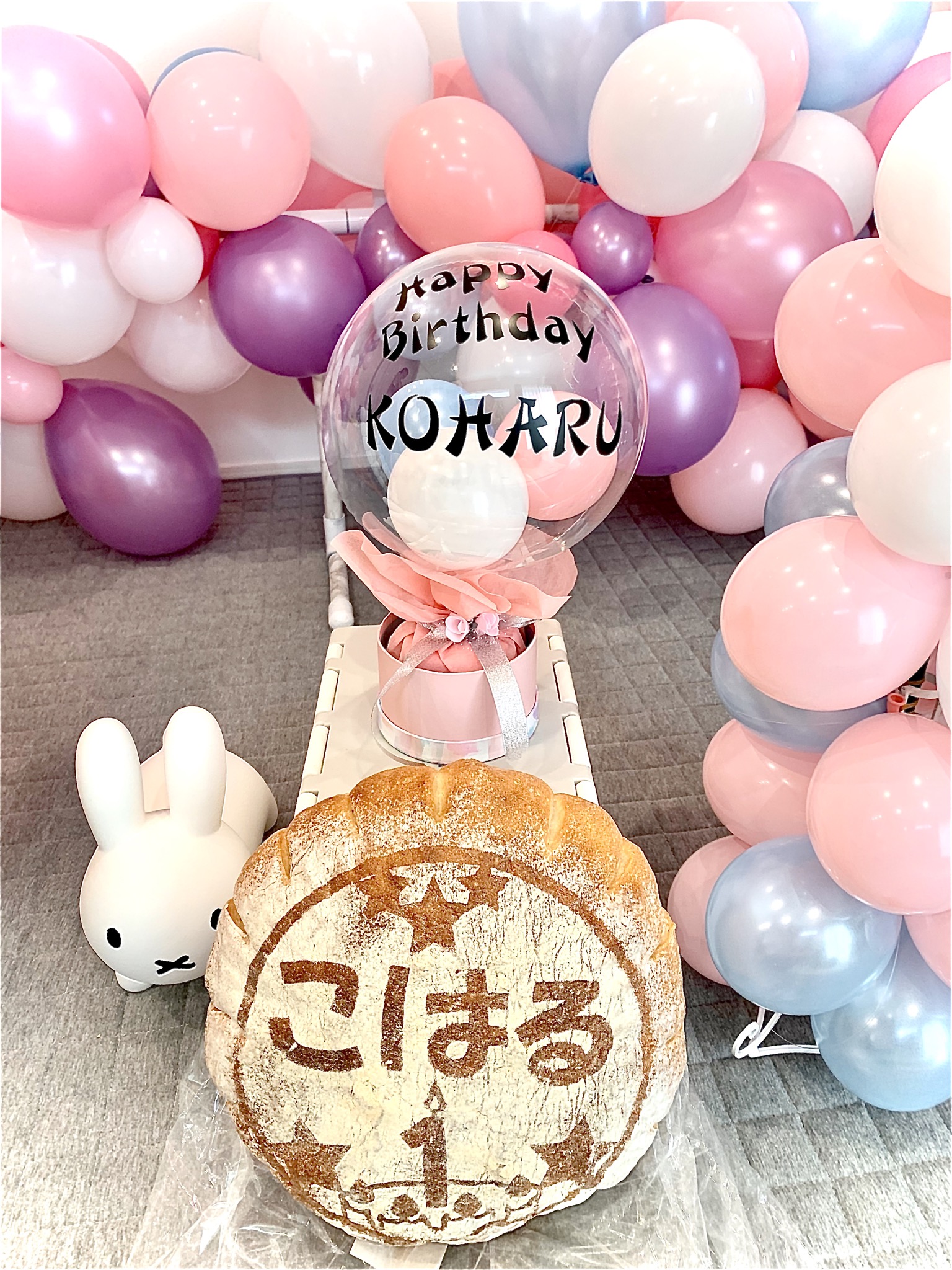 テーマカラーはパステルカラーで、1歳の子にはぴったりサイズのミニアーチを設置し、フォトブース一面を可愛く優しい色合いでいっぱいにしました。