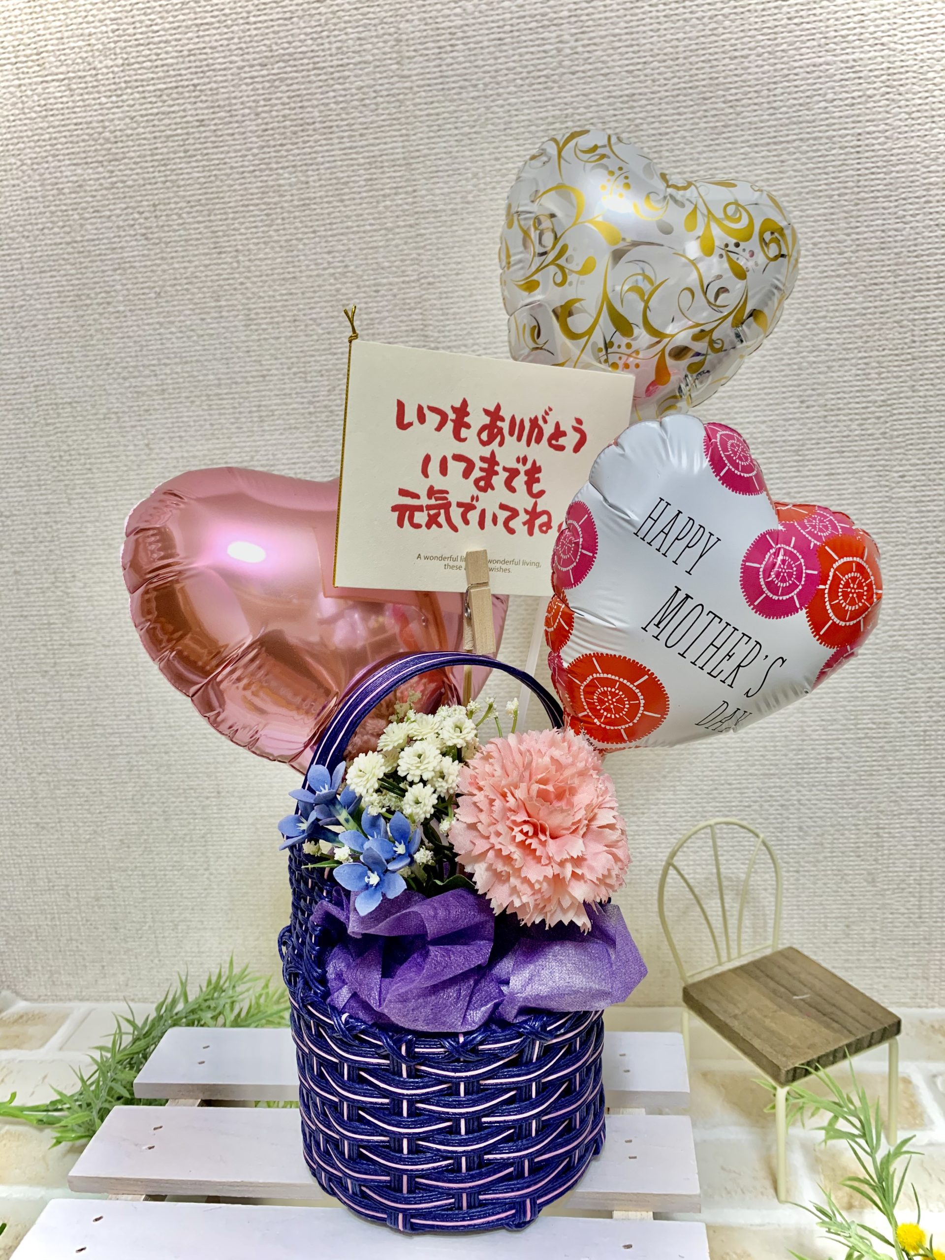 全体的に落ち着いた雰囲気に仕上げつつ、差し色にピンクのハートのバルーンとカーネーションを入れる事によって可愛さも表現しました✨