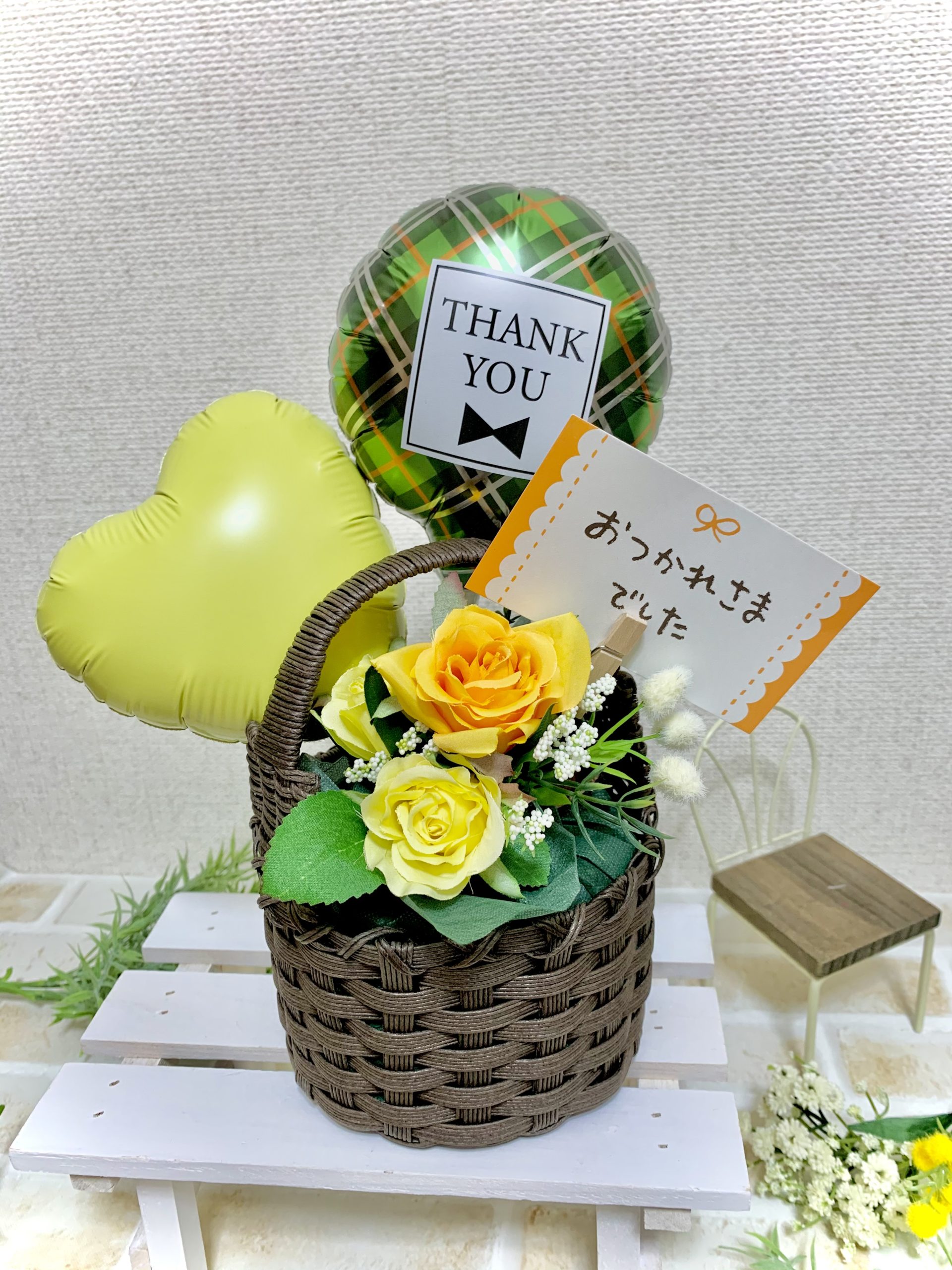バルーン&造花なので綺麗な状態で長く飾っていただけます。バルーンがしぼんだ後も土台に使用しているカゴは、小物入れなどにご使用出来ますので、二度楽しんでいただけるギフトです😉