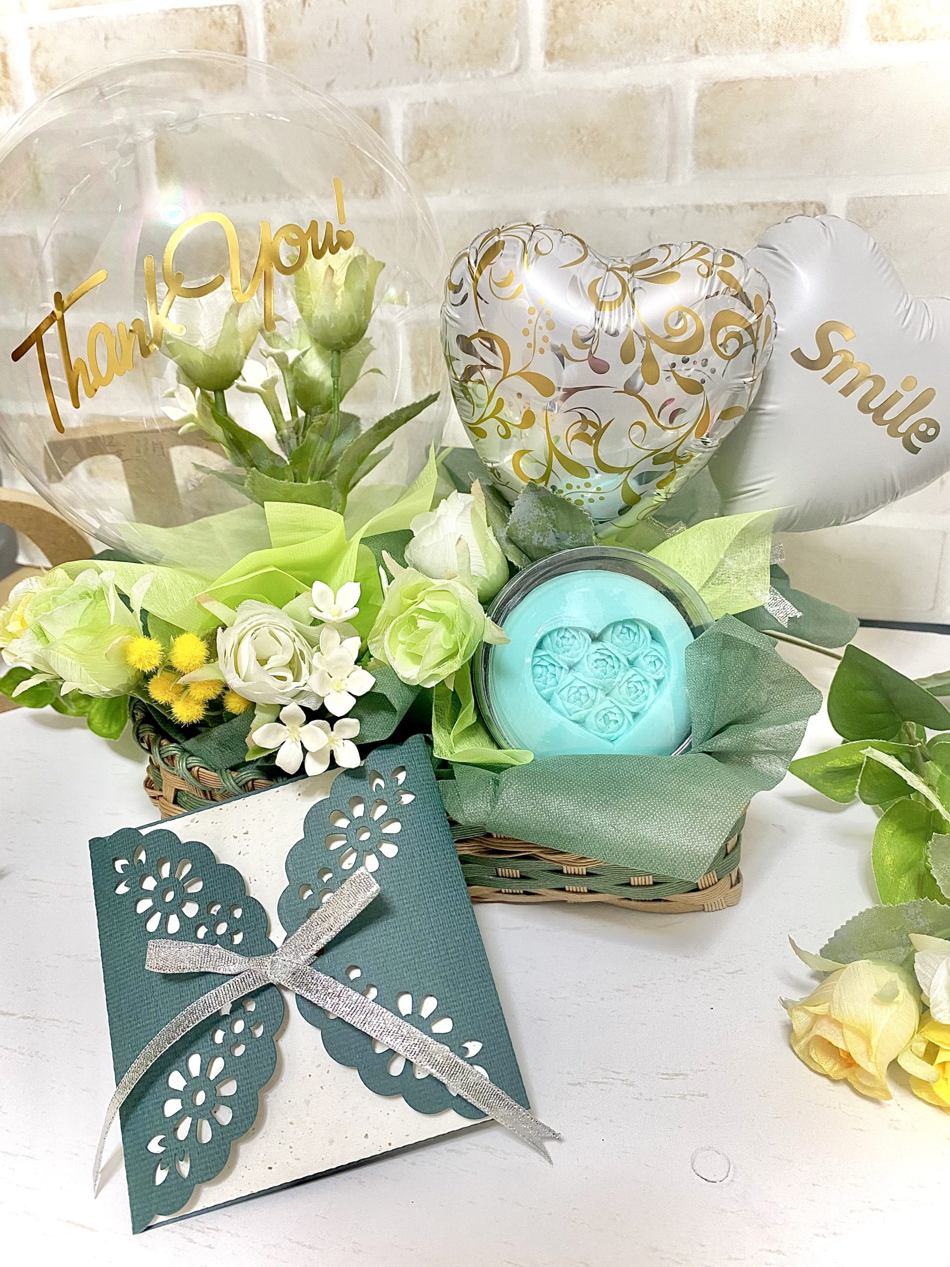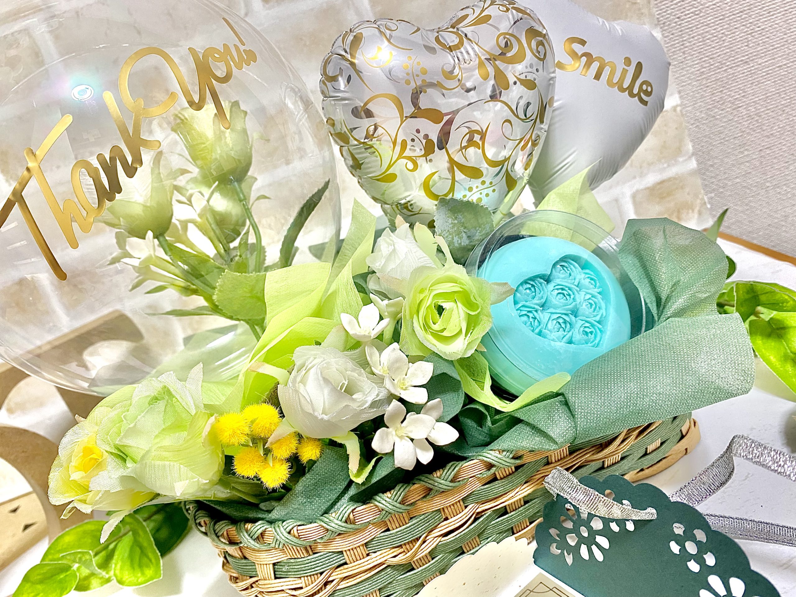 石鹸が良く見えるよう、普段のバルーンギフトで使用するカゴより少し浅めのカゴを使用しています。