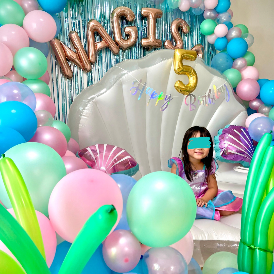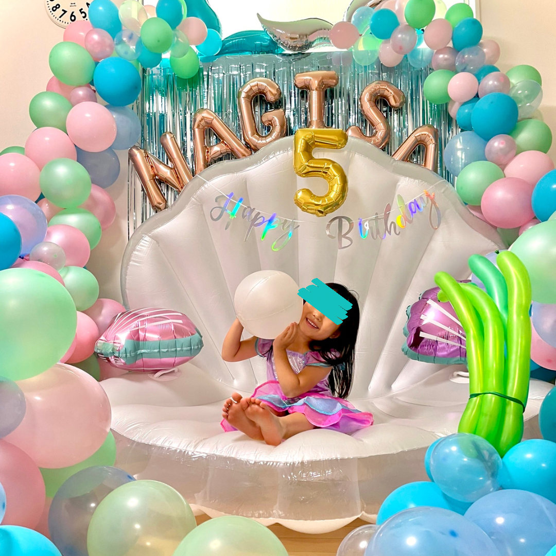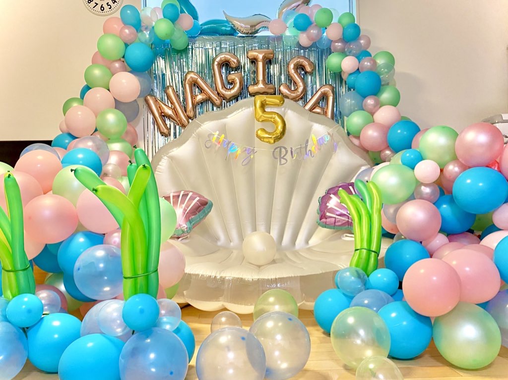 お子様の居ない間にフォトブースを設営させて頂き、帰宅してバルーンでいっぱいのお部屋に入った瞬間、とっても喜んでくれた様で、貝殻の上に座れる事に大興奮で気に入って頂けました☺️